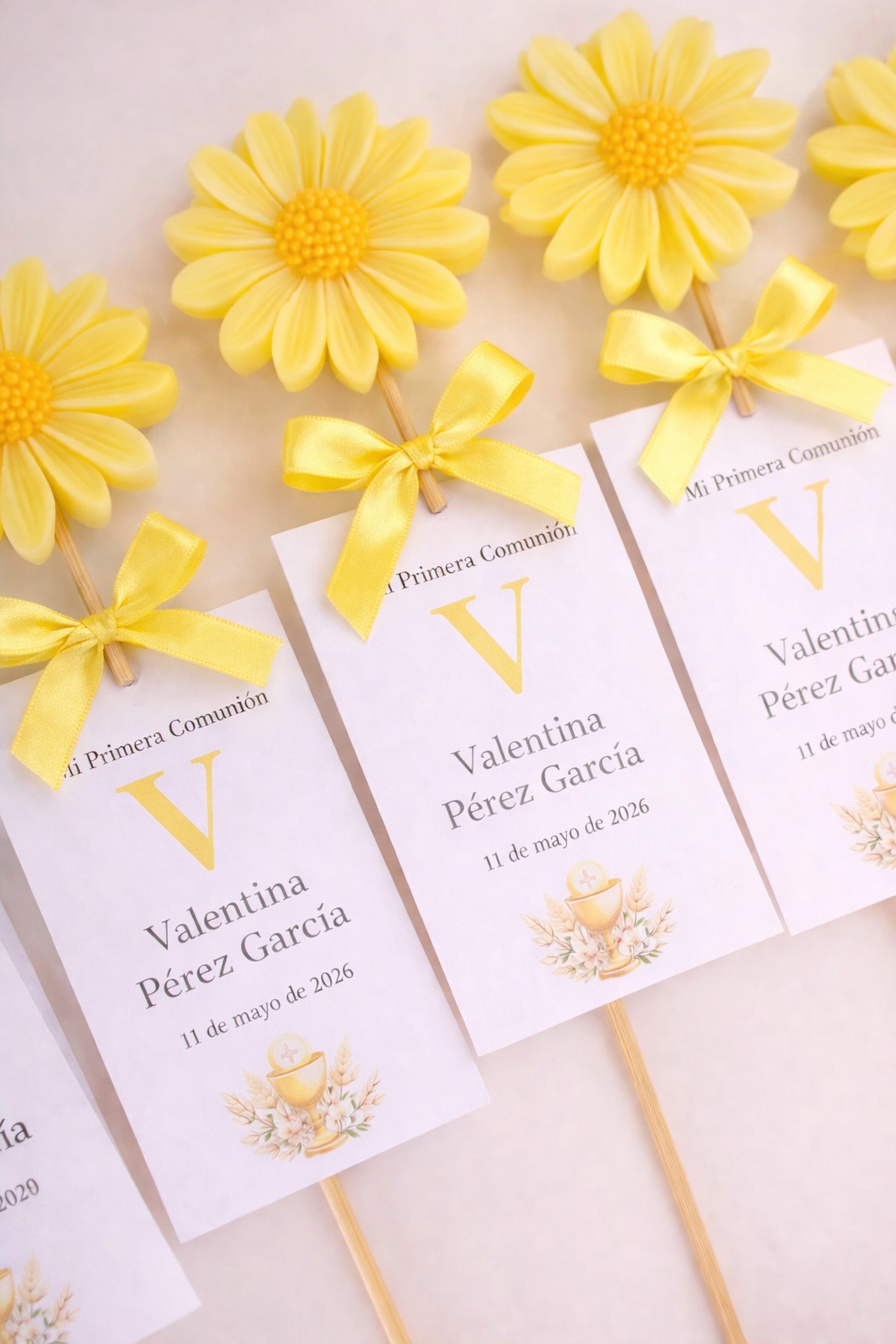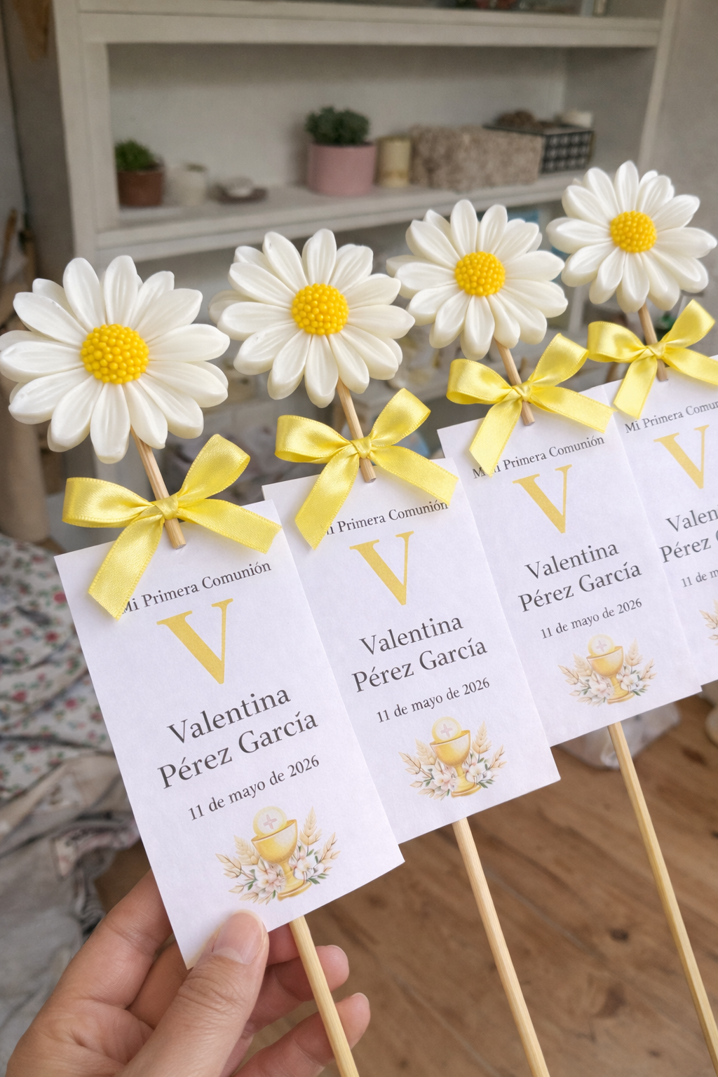 Nuestra margarita de cera es un detalle delicado y especial, ideal como recuerdo de Primera Comunión. Elaborada artesanalmente y con acabados cuidados, representa pureza, alegría y dulzura, convirtiéndose en un obsequio bonito y significativo para familiares y amigos.