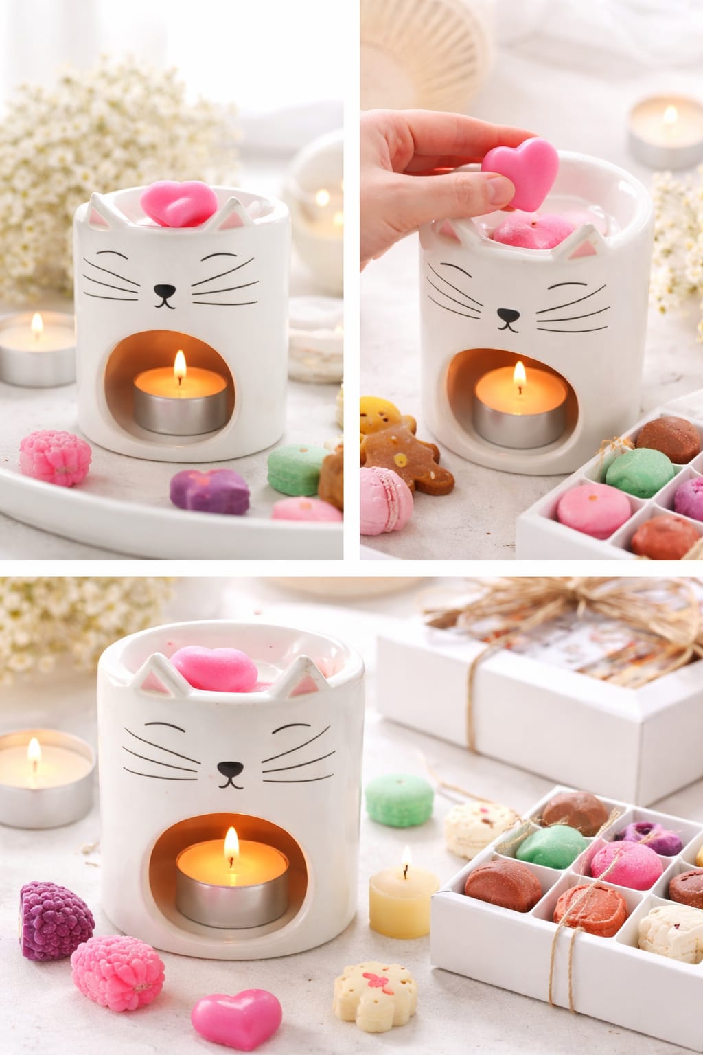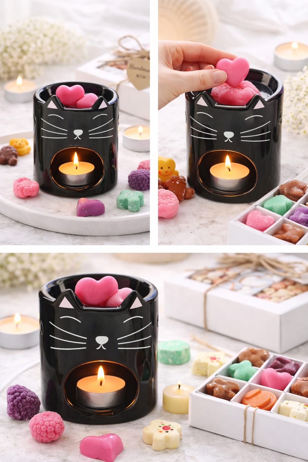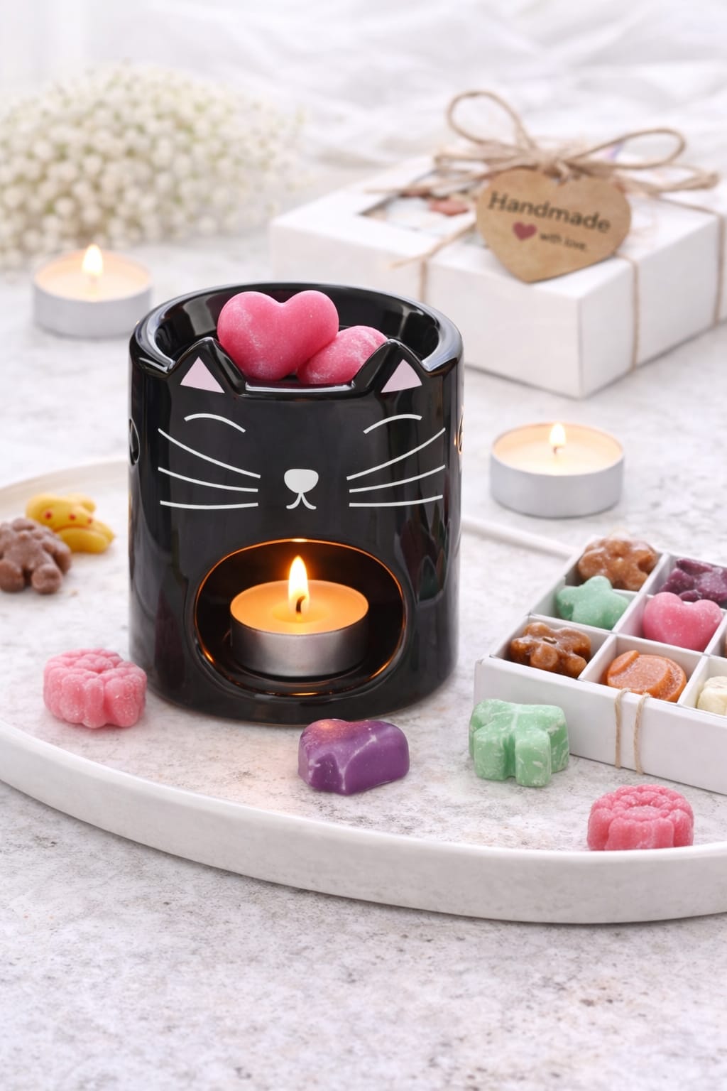 El pack incluye: Quemador de cerámica diseño gatito. Tarrina de 50g de wax melts. 2 sobres individuales de 20 cada uno + Regalito