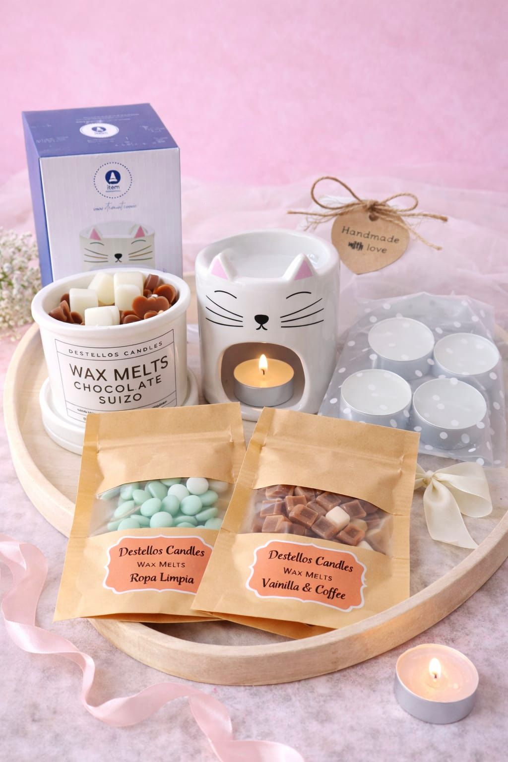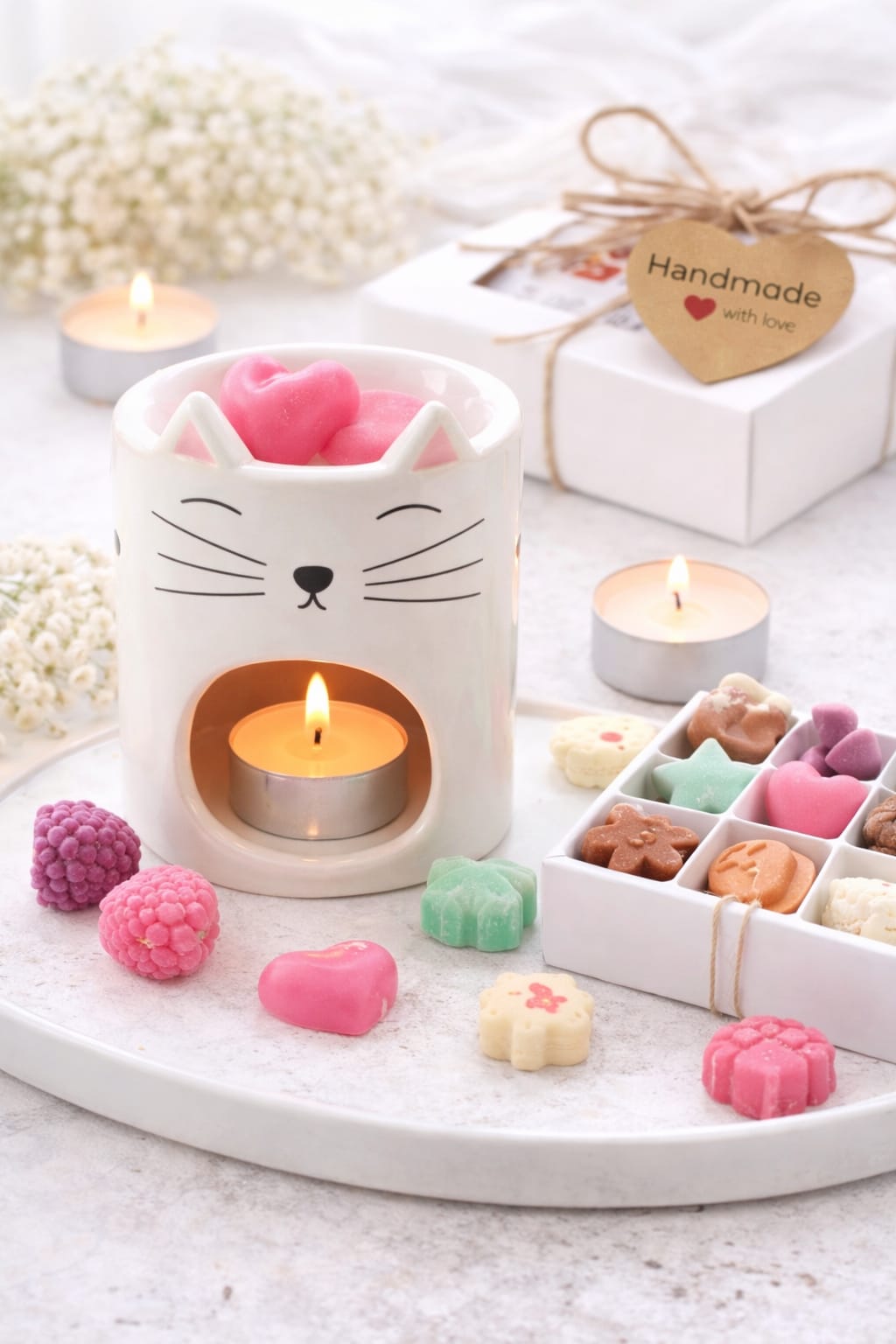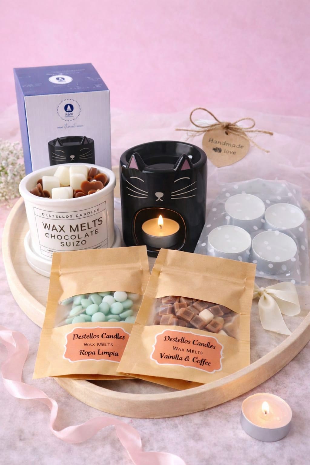 El pack incluye: Quemador de cerámica diseño gatito. Tarrina de 50g de wax melts. 2 sobres individuales de 20 cada uno + Regalito